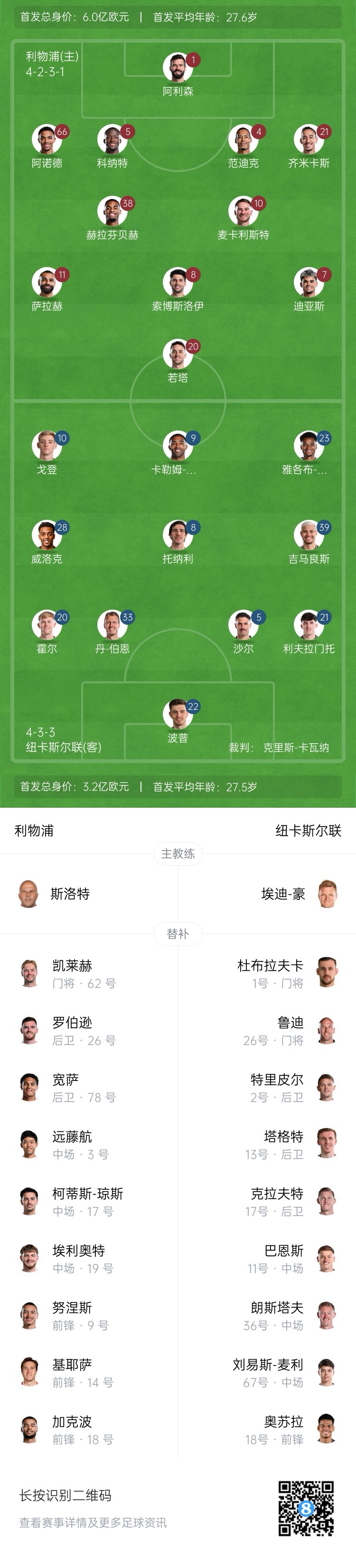 2025-02-27 08:11:32利物浦vs紐卡首發(fā):薩拉赫、若塔、迪亞斯先發(fā),索博出戰(zhàn)
