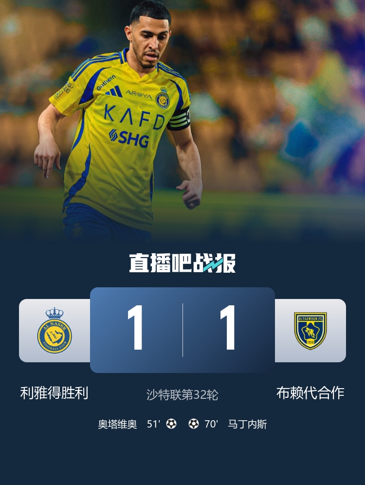 利雅得勝利1-1戰(zhàn)平布賴代合作,還剩2輪的情況下落后新月7分,無緣下賽季亞冠精英聯(lián)賽。