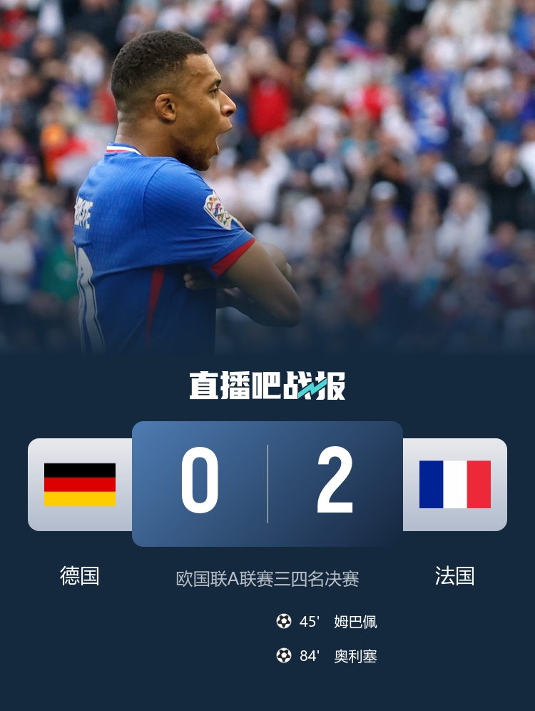 歐國聯A聯賽三四名決賽,法國2-0德國,獲得歐國聯季軍。上半場,沃爾特馬德錯失單刀,阿德耶米造點經VAR回放后改判假摔,維爾茨中柱,姆巴佩補時破門;下半場,翁達夫進球被吹,小圖拉姆射中立柱,奧利塞替補建功。