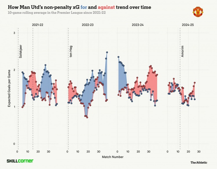 缺乏足夠的訓練時間,沒有完全匹配阿莫林戰(zhàn)術哲學的球員,是造成這種情況的關鍵因素,但球員缺乏主動性,也是一個很大的問題。在此前對陣埃弗頓的比賽中,這一點就表現(xiàn)得很明顯,B費的任意球是比賽前70分鐘曼聯(lián)為數(shù)不多的活力時刻,而他們在這場比賽中的預期進球數(shù)僅為0.04球。