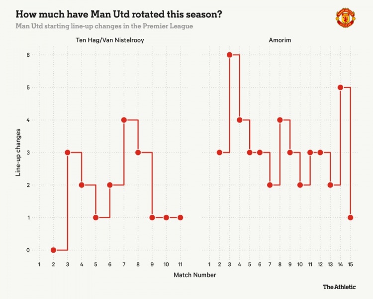 Conor O'Neill:我認為,15場英超比賽仍是一個相對較小的樣本量,這段時間阿莫林一直在尋找自己的最強11人。再加上關鍵球員利桑德羅-馬丁內(nèi)斯、芒特、阿瑪?shù)碌膫栴},平淡的冬季轉(zhuǎn)會窗,阿莫林還沒有真正將自己的首發(fā)陣容穩(wěn)定下來。