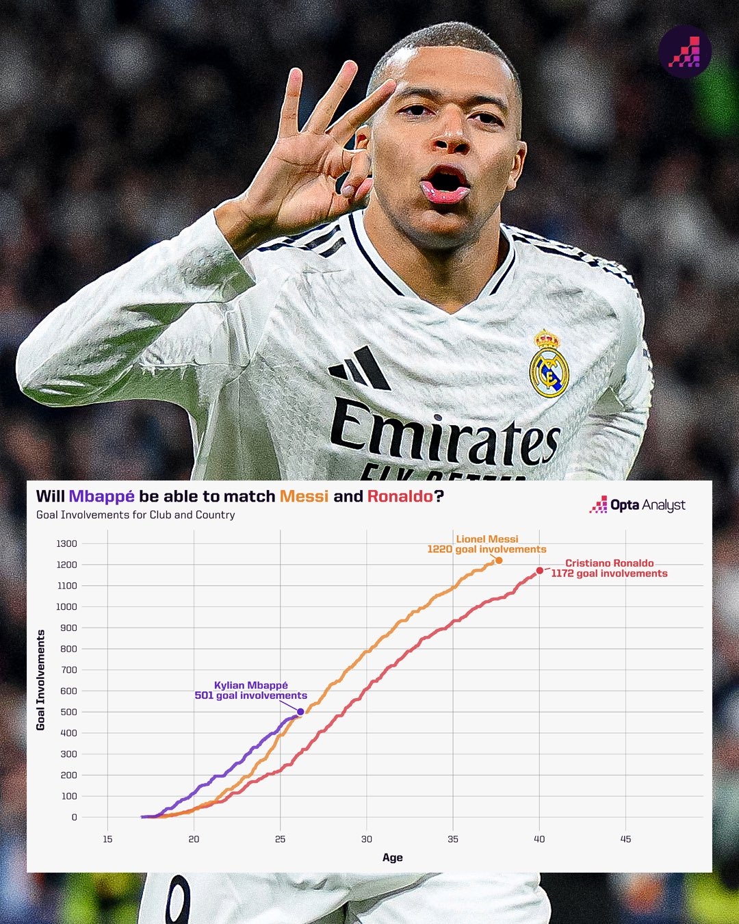 2025-02-21 17:46:08梅羅均破千!姆巴佩生涯直接參與501球 與同年齡梅西相當(dāng)&高于C羅