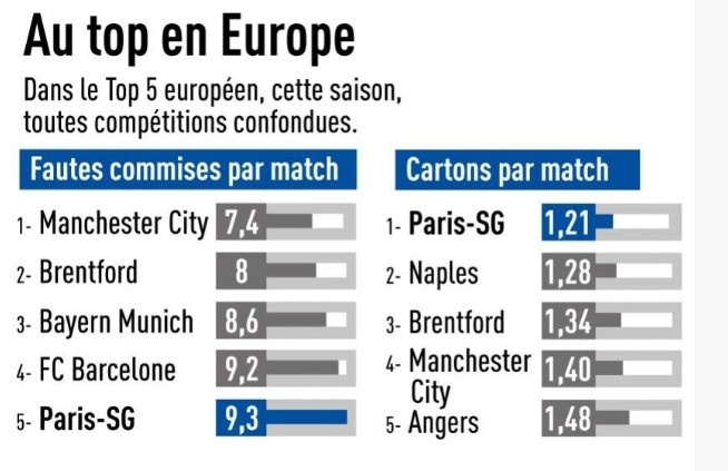 3月1日訊 法國媒體《隊(duì)報(bào)》對(duì)五大聯(lián)賽本賽季場均犯規(guī)次數(shù)和吃牌數(shù)最少的球隊(duì)進(jìn)行了統(tǒng)計(jì),其中巴黎圣日耳曼在兩項(xiàng)統(tǒng)計(jì)中都排在了前五名,具體如下: