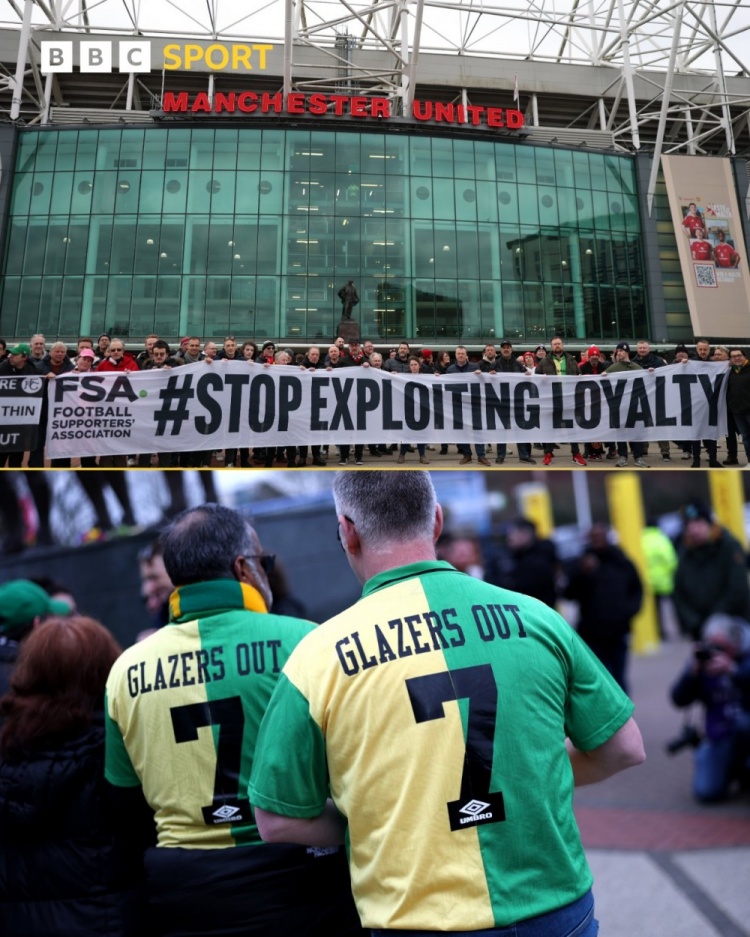 比賽開(kāi)始前,兩隊(duì)球迷在老特拉福德球場(chǎng)前進(jìn)行了聯(lián)合抗議活動(dòng),拉出了寫有“停止剝削忠誠(chéng)”的橫幅。此外,也有部分曼聯(lián)球迷仍在堅(jiān)持表達(dá)對(duì)格雷澤家族的不滿,他們穿上了印有“格雷澤滾蛋”的球衣。