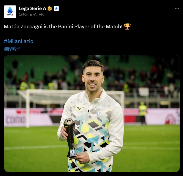 2025-03-03 08:50:38首開記錄!意甲官方:扎卡尼當選米蘭vs拉齊奧全場最佳球員