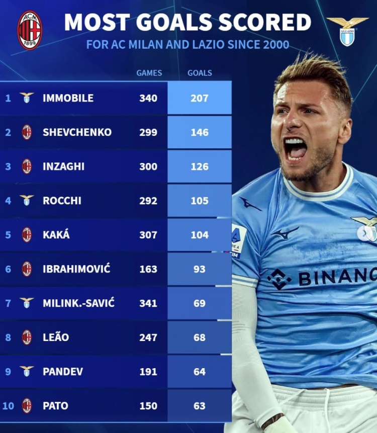 2025-03-03 08:54:17德轉(zhuǎn)列米蘭&拉齊奧新世紀(jì)射手榜:因莫比萊居首,舍瓦、伊布在列