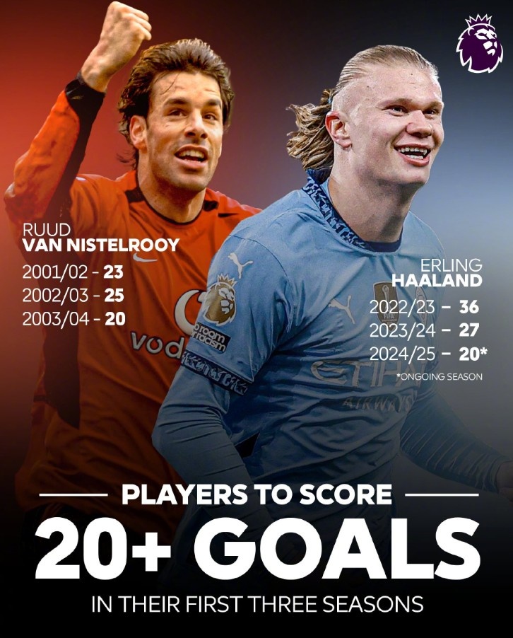 2025-03-04 20:33:08英超歷史只有兩名球員生涯前三賽季進(jìn)球20+:分別是范尼和哈蘭德