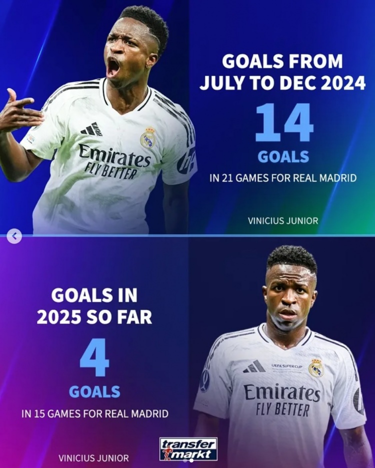 2025-03-05 03:48:31咋回事?維尼修斯上半賽季14球&今年僅4球,姆巴佩同期各進(jìn)14球