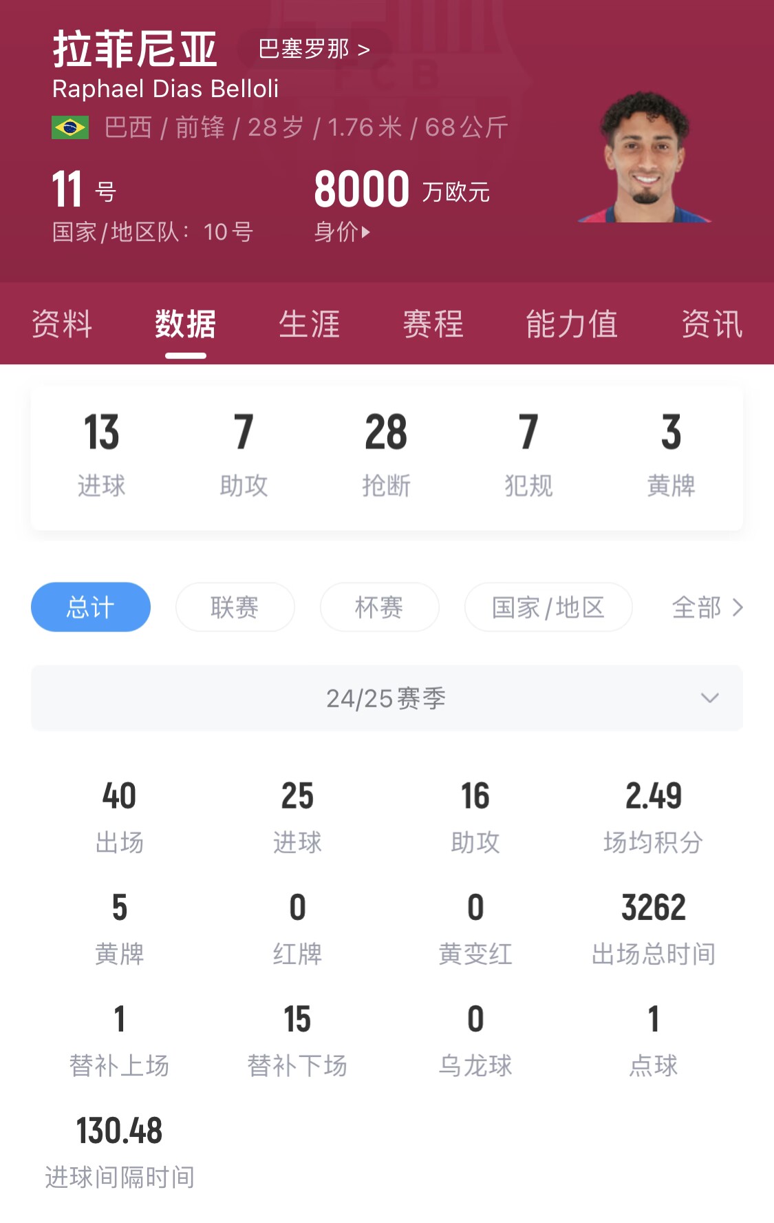 2025-03-06 19:57:20實(shí)打?qū)嵉?000萬!拉菲尼亞25球16助,金球獎(jiǎng)賠率第3高于維尼修斯