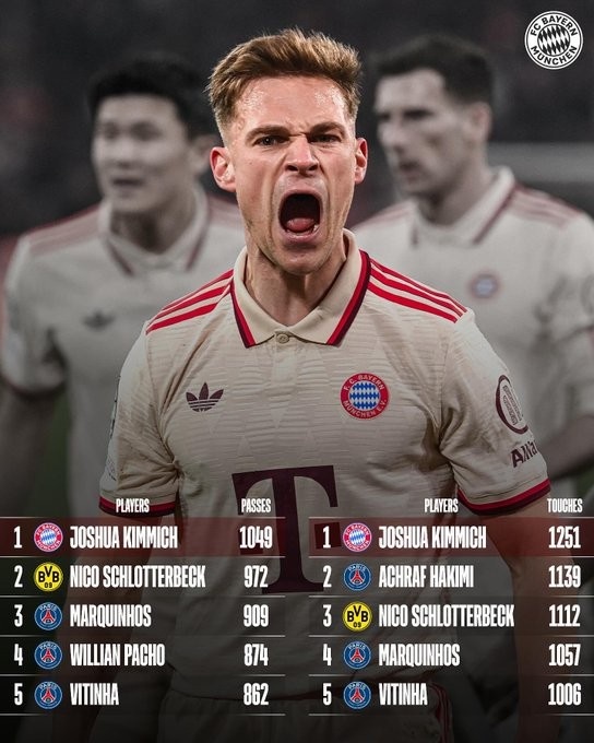 基米希領(lǐng)跑本賽季歐冠傳球與觸球統(tǒng)計(jì)榜